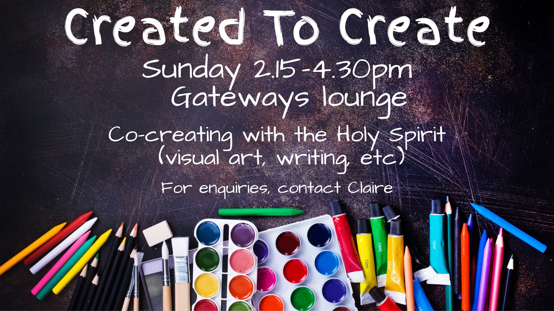 Gather with other creative people to be encouraged creatively, and to practise creating Holy Spirit-inspired visual art, writing, etc.